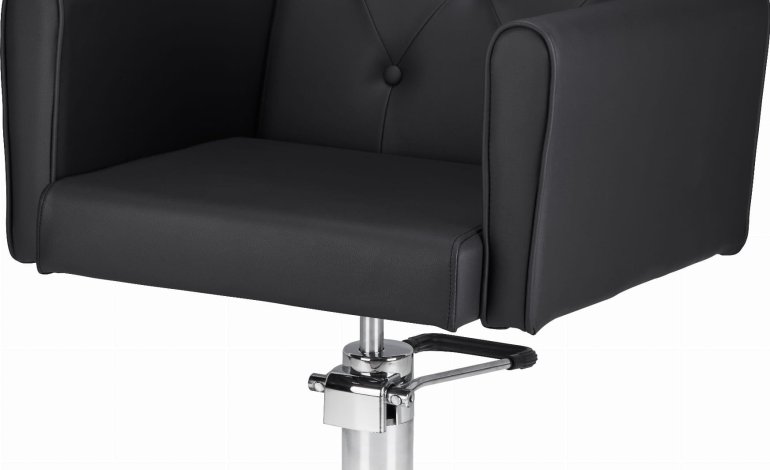 Elegancki fotel fryzjerski z tapicerką z eko skóry, ozdobionym pikowanym oparciem, wyposażony w hydrauliczną pompę oraz podstawę w kształcie dysku.